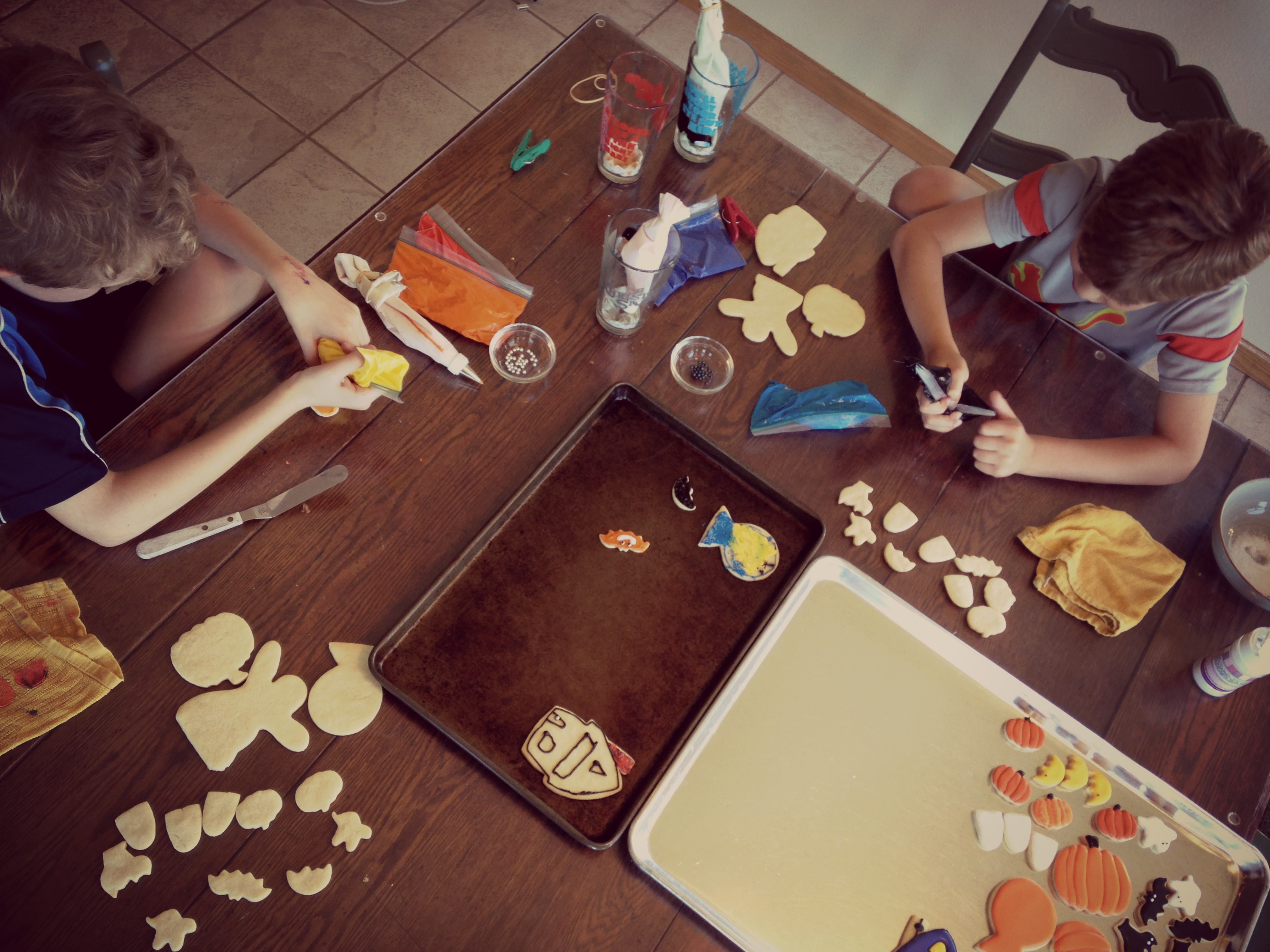 Bake off your favorite cut out cookie in various halloween shapes and sizes. Mix up some frosting, grab the sprinkles and have at it. I put our frosting in snack size resealable baggies with one tip cut off a bit, to keep the mess at a (slighter) minimum.