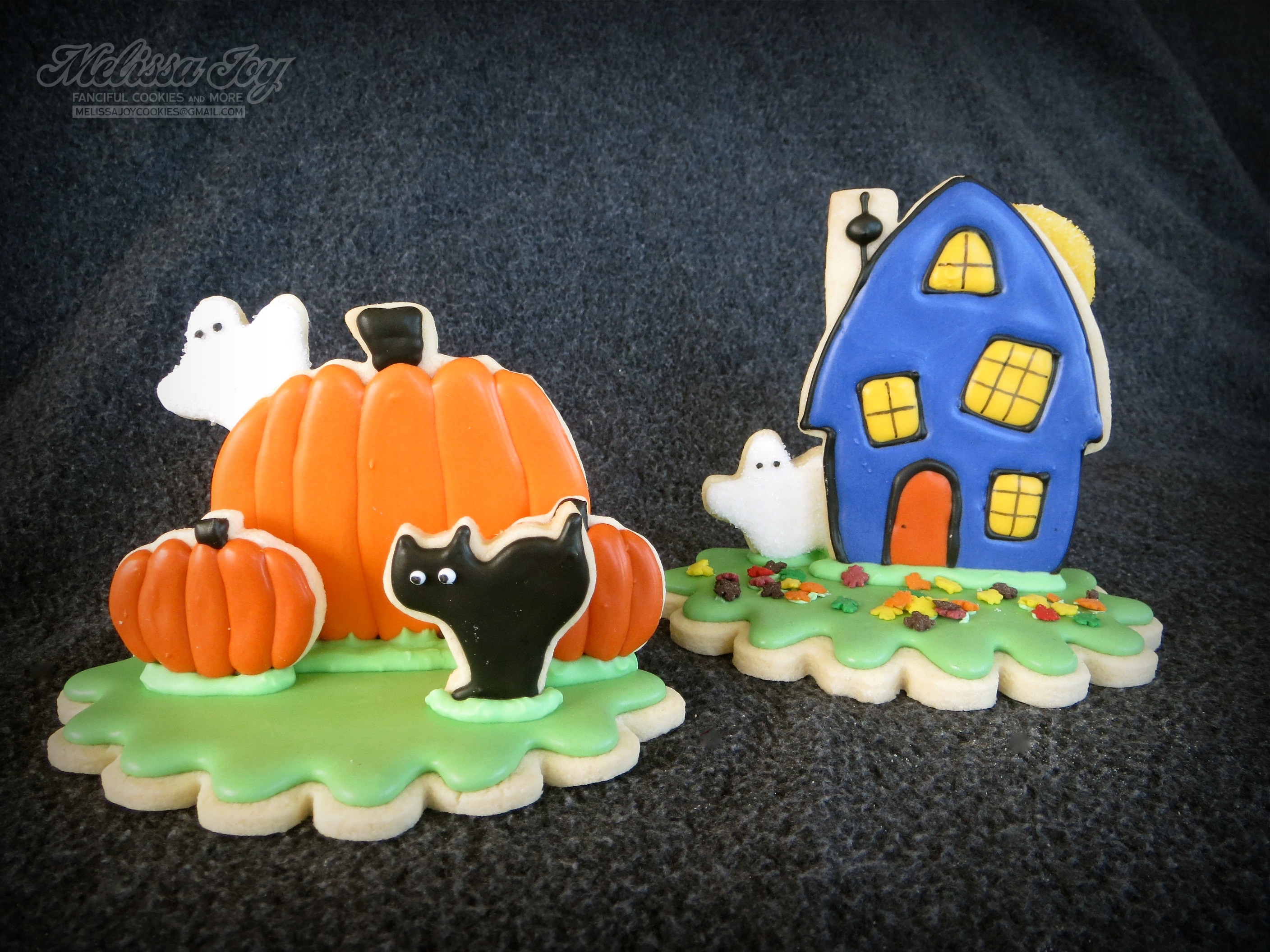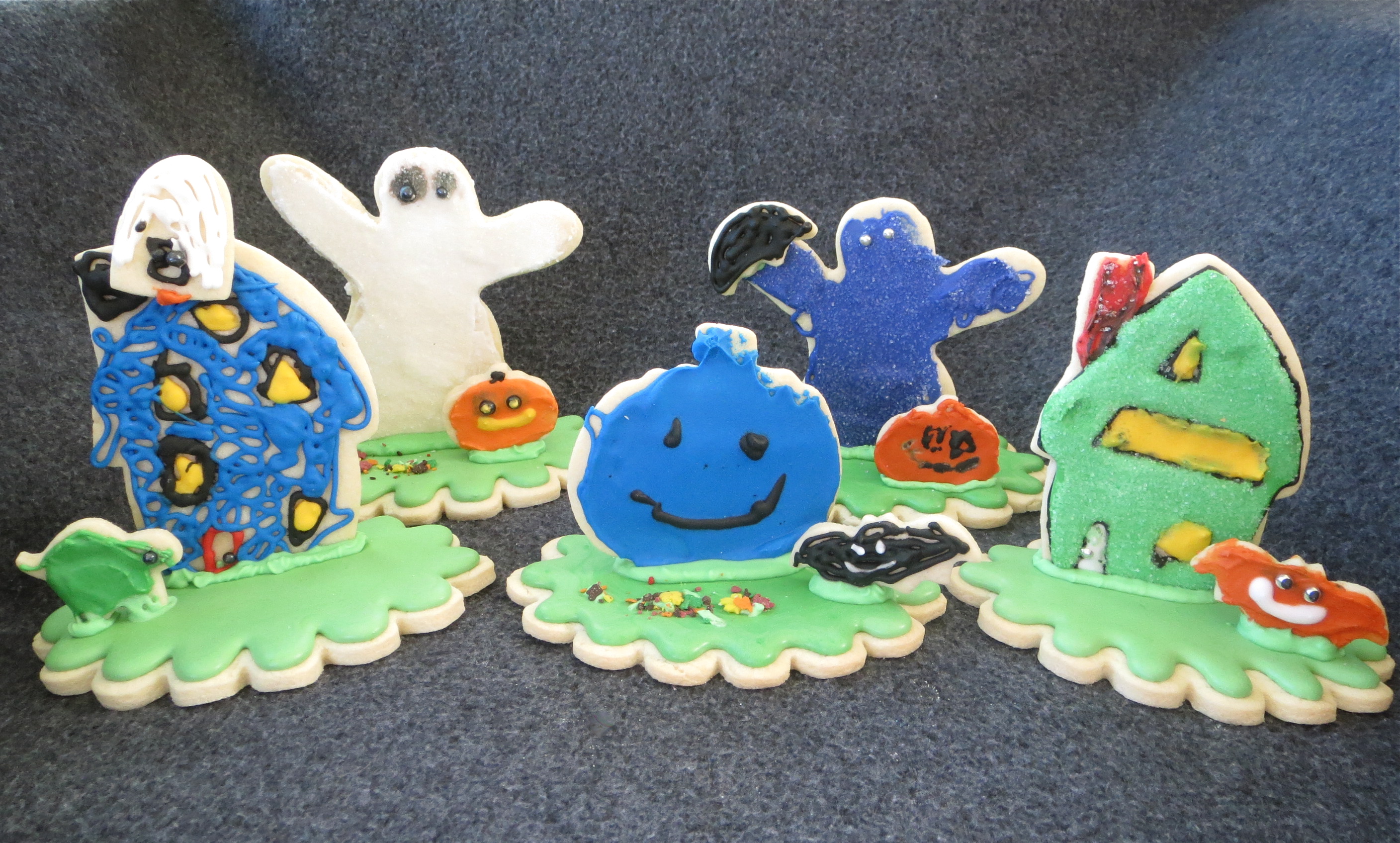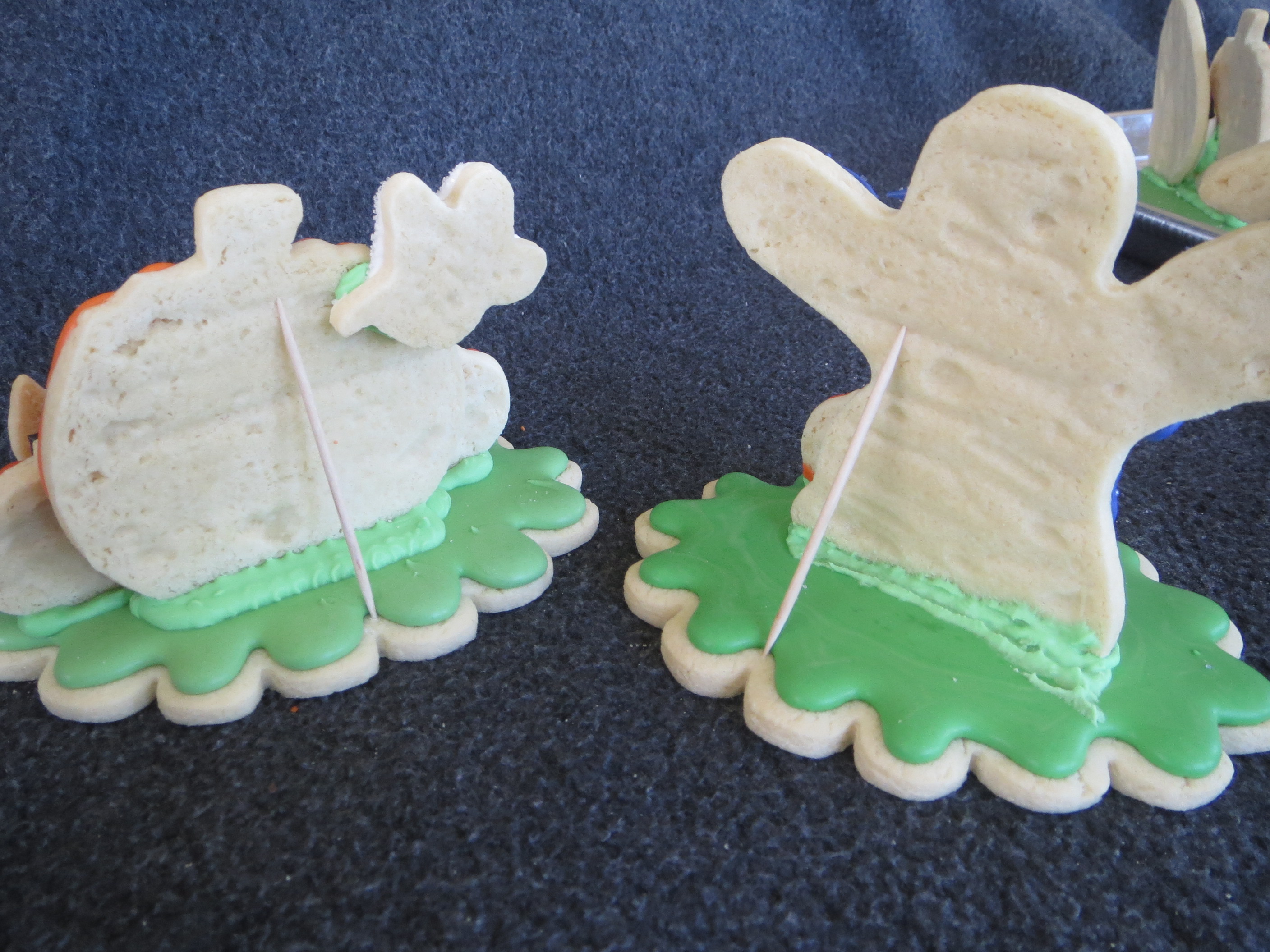 Once our cookies dried, we assembled our scenes by using frosting to “glue” the shapes to the base.