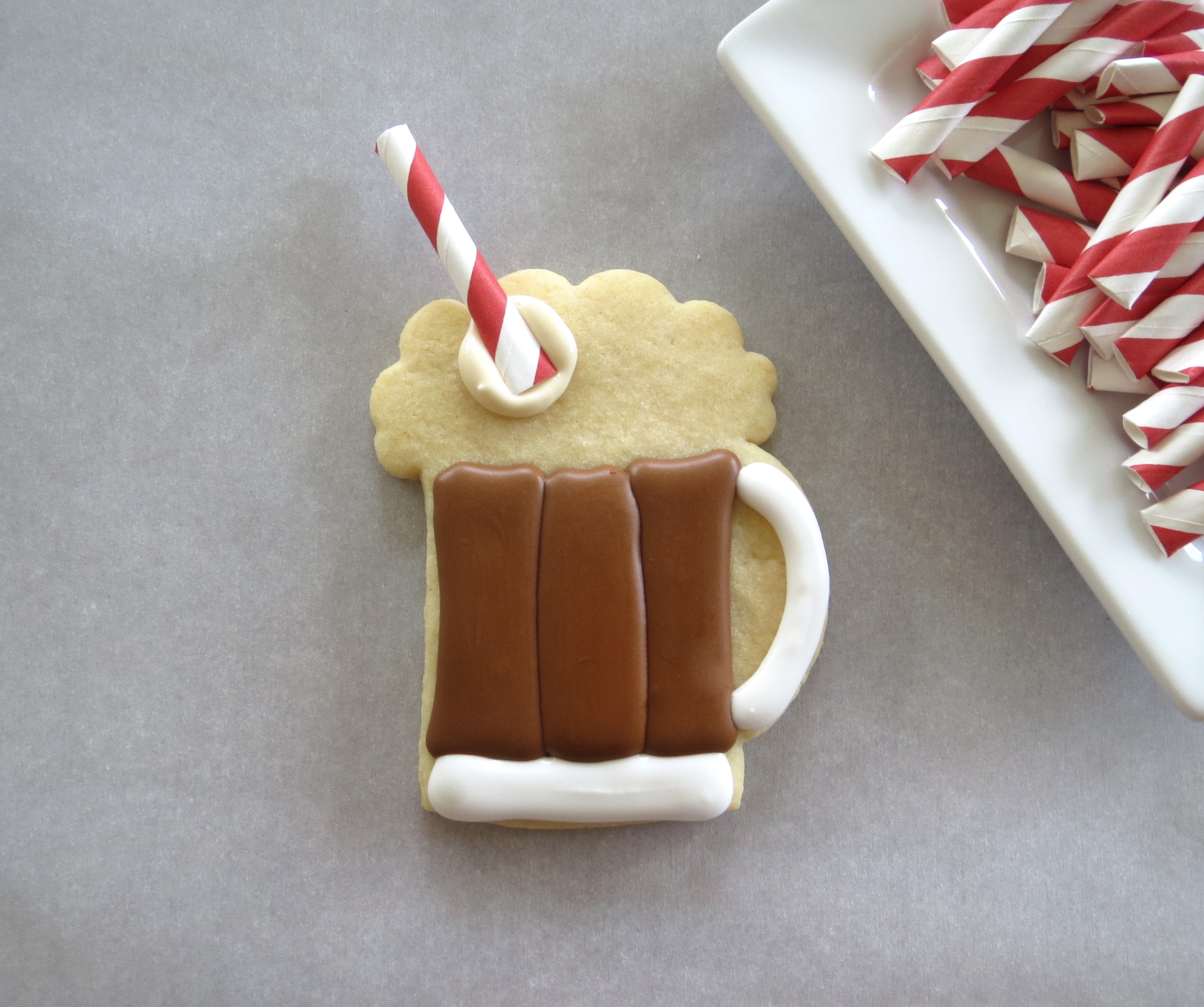 With a squirt of ivory icing, adhere the straw onto the cookie.